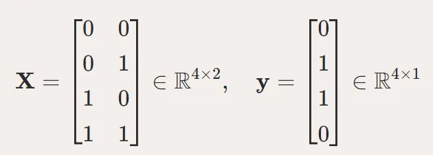 每一行代表四个可能的异或输入之一,输出向量显示预期的异或结果。