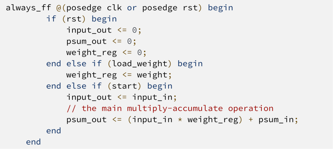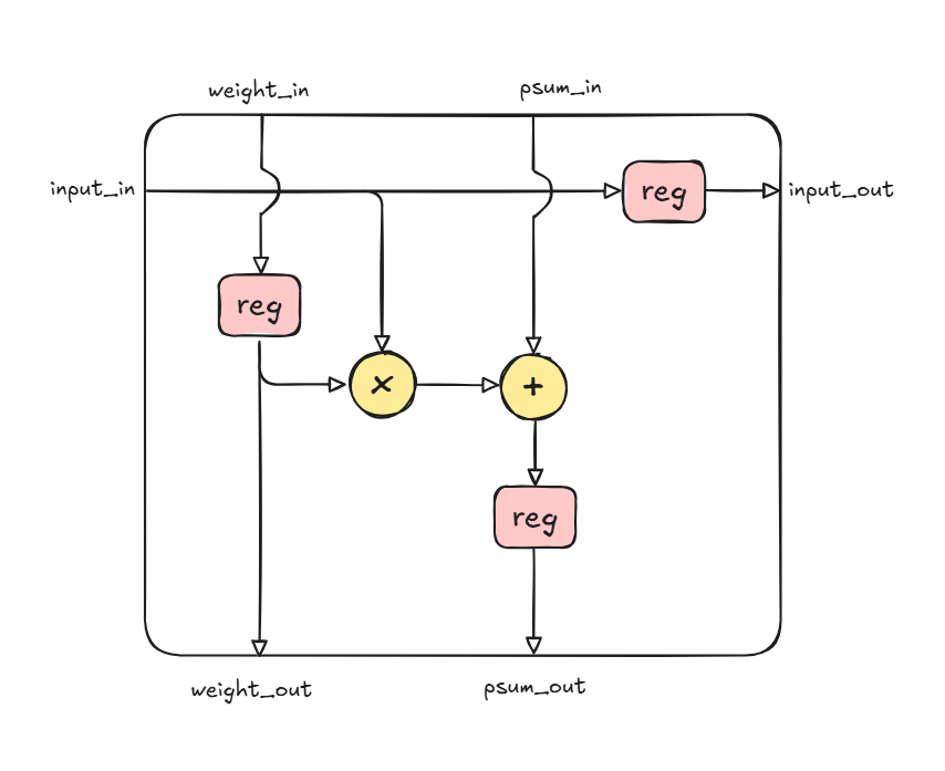 处理元件(PE)架构显示乘法累加运算(无负载权重和启动标志)。