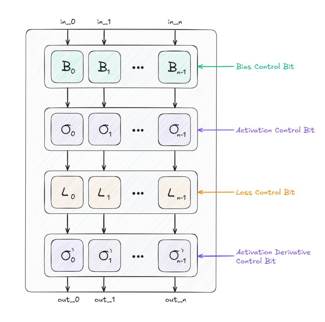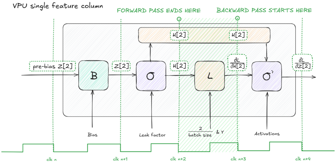 此外,通过为每个模块整合控制信号(称之为 VPU 通路位),我们可以选择性地启用或跳过特定操作。这使得 VPU 足够灵活,能够同时支持推理和训练。例如,在正向传递过程中,我们希望应用偏差和激活函数,但跳过计算损失或激活函数导数。当转换到反向传递时,所有模块都会参与,但在反向链中,我们只需要计算激活函数导数。由于流水线技术,所有流经 VPU 的值都会经过四个模块,任何未使用的模块都只是充当寄存器,将其输入转发到输出,而不执行计算。