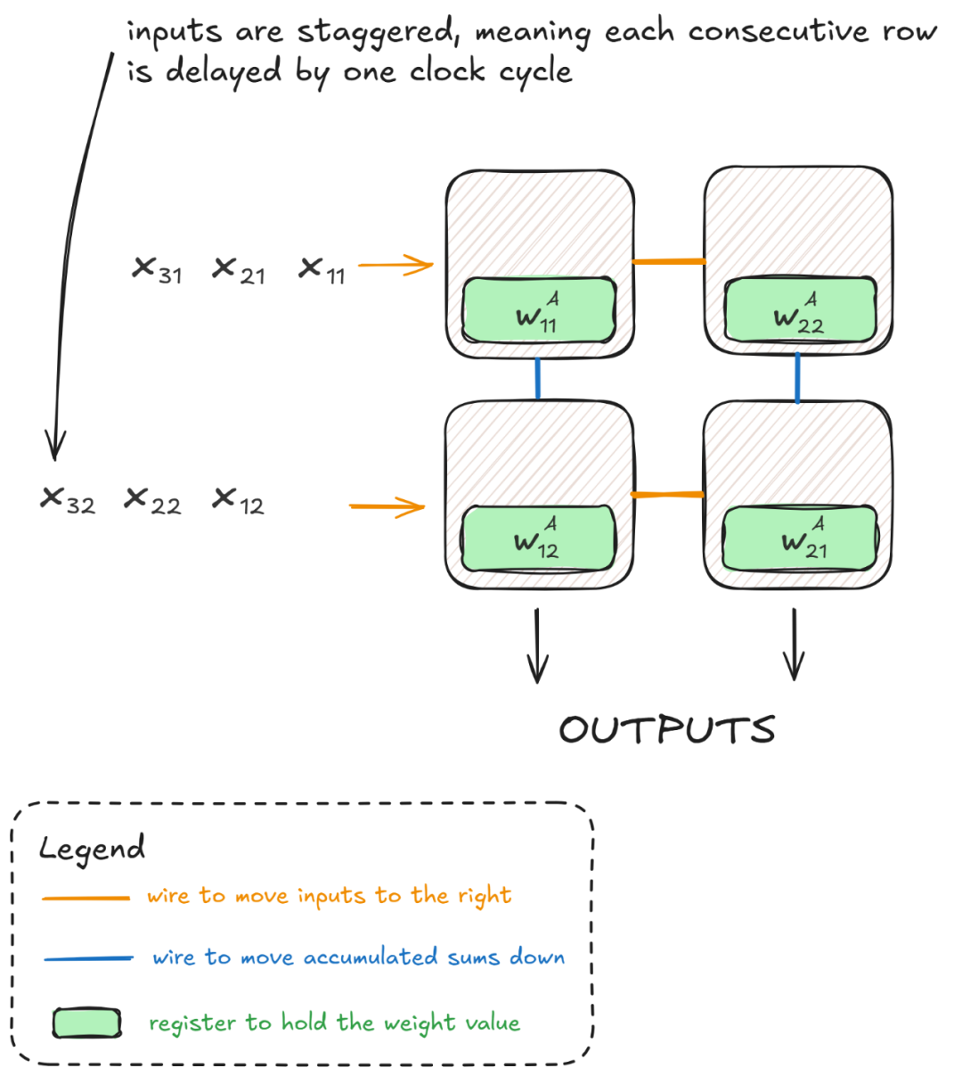为了执行交错,我们为权重和输入设计了几乎相同的累加器,分别位于脉动阵列的上方和左侧。