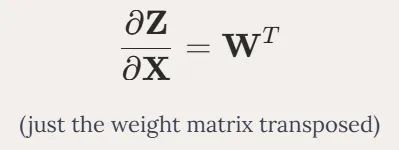 绘制出完整的计算图后,我们发现了一个惊人的现象:反向传播中的最长链与前向传播非常相似!在前向传播中,我们将激活矩阵与转置后的权重矩阵相乘。在后向传播中,我们将梯度矩阵与未转置的权重矩阵相乘。这就像照镜子一样!