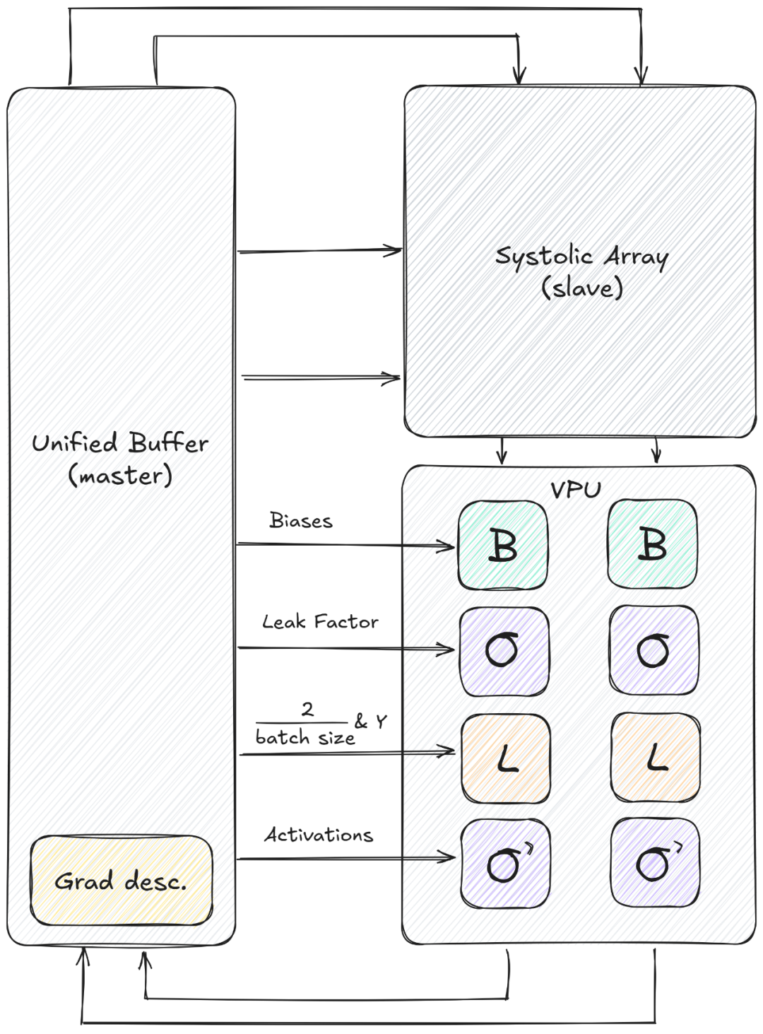 都需要我们在前向传播过程中计算后激活函数 (H)。这意味着我们需要将每一层的输出存储在某种内存中才能进行训练。为此,我们创建了一个新的暂存器内存模块,我们称之为统一缓冲区 (UB)。这样,就可以在前向传播过程中计算 H 值后立即存储它们。