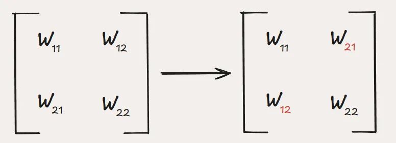 请注意,旋转和交错没有任何数学意义 —— 它们只是为了使脉动阵列正常工作。转置也只是为了进行数学记账 —— 它是使矩阵数学运算正常工作所必需的,因为我们在神经网络图中设置权重指针的方式。