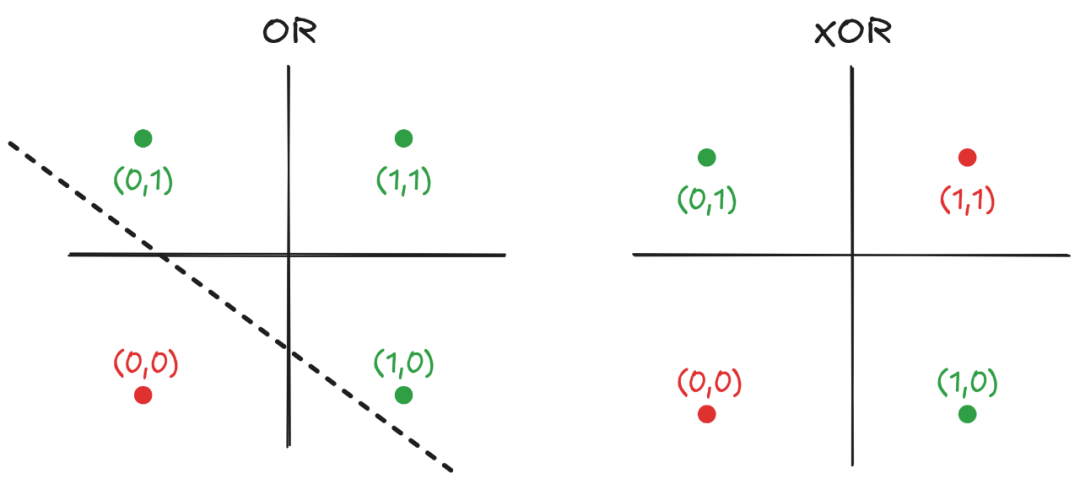 我们选择这个特定网络的原因是,我们的目标是针对 XOR 问题(神经网络的「Hello World」)进行推理和训练。XOR 问题是神经网络可以解决的最简单的问题之一。所有其他门(AND、OR 等)都可以仅使用一条线性线(一个神经元)来区分哪些输入对应于 0,哪些输入对应于 1,从而根据输入预测输出。但是,要对所有 XOR 进行分类,需要一个 MLP,因为它需要弯曲的决策边界,而这仅靠线性方程无法实现。