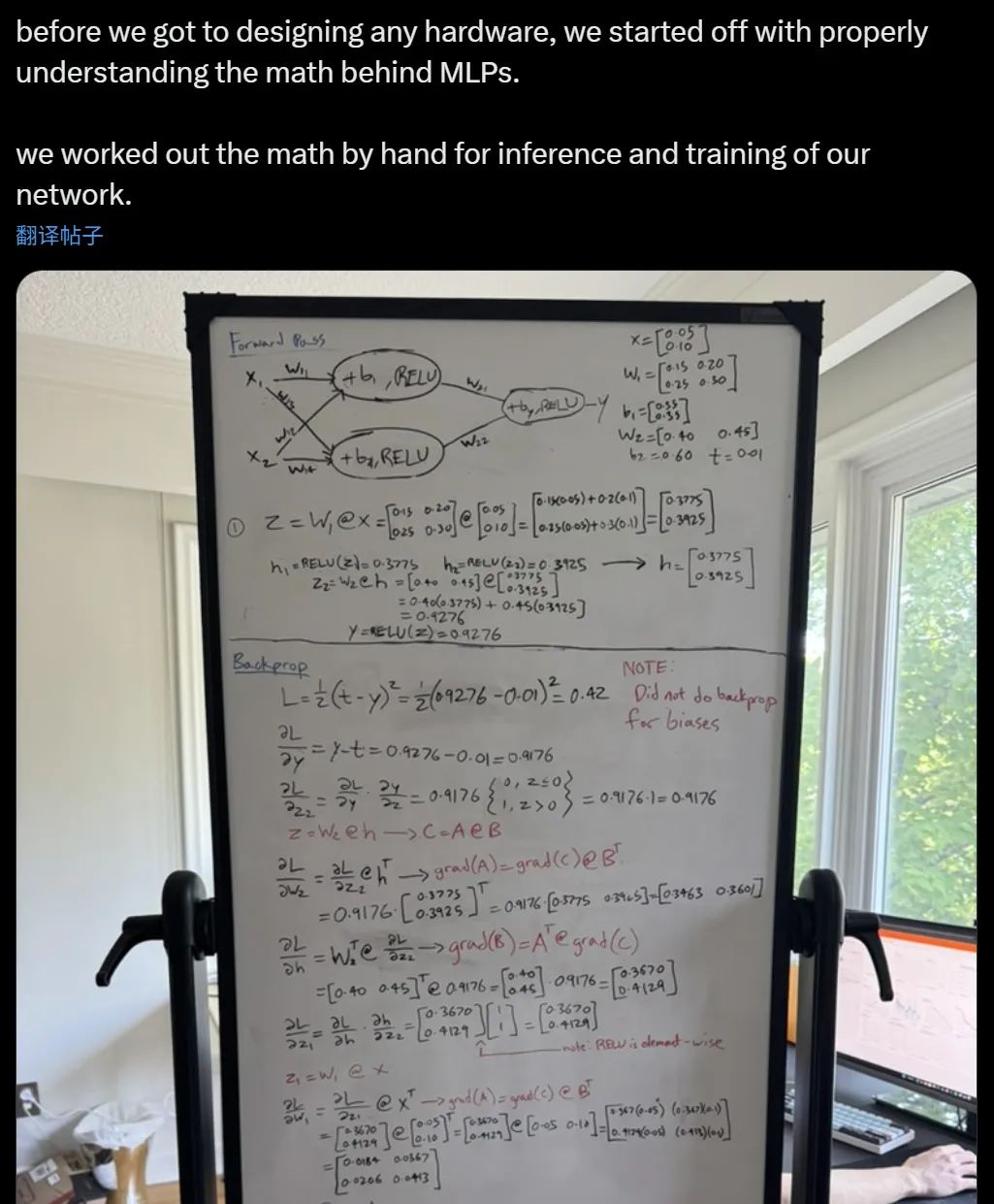 有趣的是,他们并非芯片设计专业的学生,打造 TPU 是从理解多层感知机(MLP)这样的神经网络基本概念开始的。为此,他们还手工计算了网络推理和训练所需的数学运算。