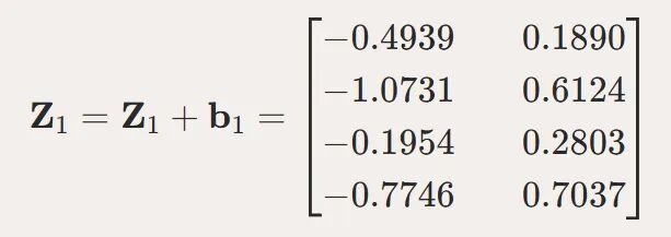 偏差向量 b 会在矩阵的所有行上转发 —— 这意味着它会被添加到每个 Z 行。