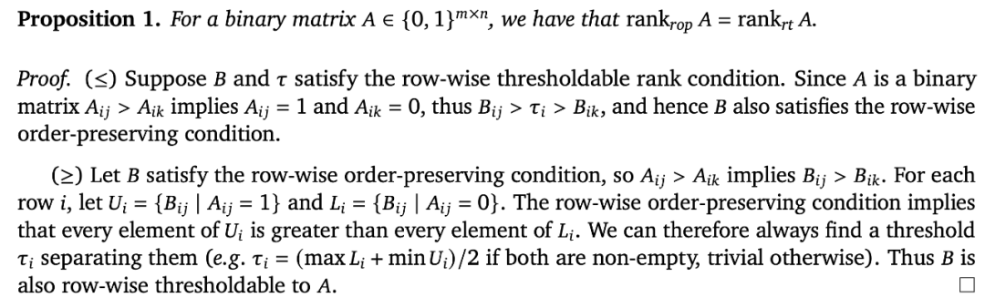 理论上限。对于二进制矩阵,逐行排序和逐行阈值化是等价的表征能力概念。