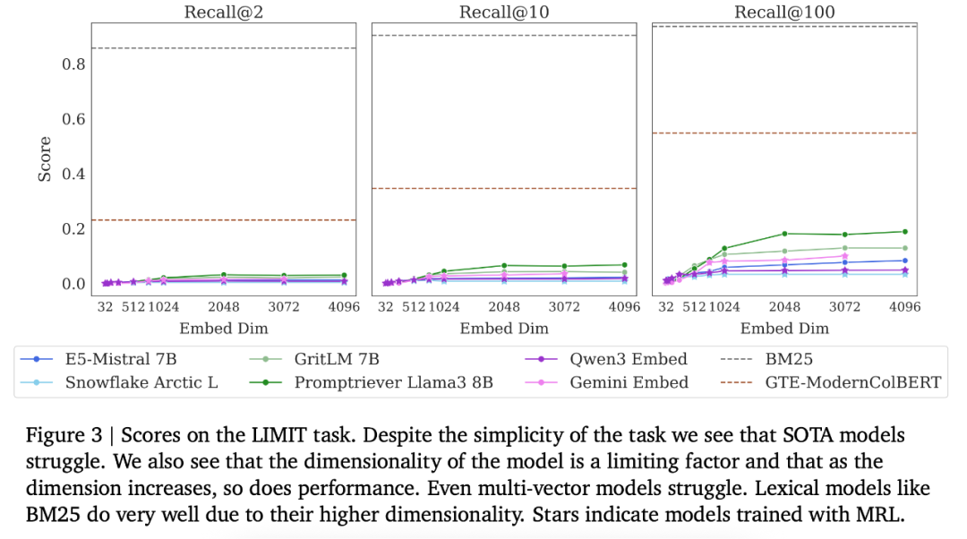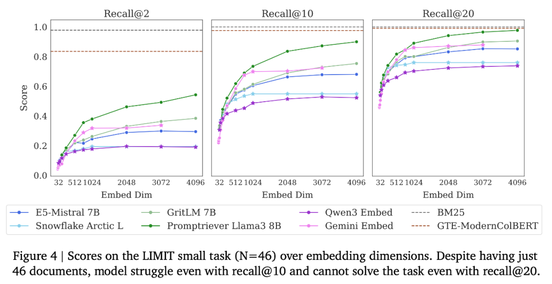这意味着,嵌入模型存在一个不可逾越的限制,无法单纯依靠「更大的模型」来突破。