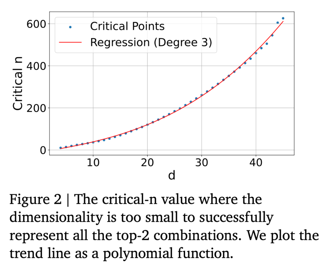 为了证明这一理论限制对任何模型或训练数据都成立,研究者采用了一种「最佳情况」设定,即向量本身是使用测试数据直接进行优化的。实验发现,对于每个嵌入维度 d 都存在一个临界点,一旦文档数量超过该点,嵌入维度就不足以编码所有的组合。他们还证明了这种临界关系可以通过一个多项式函数进行经验性建模。