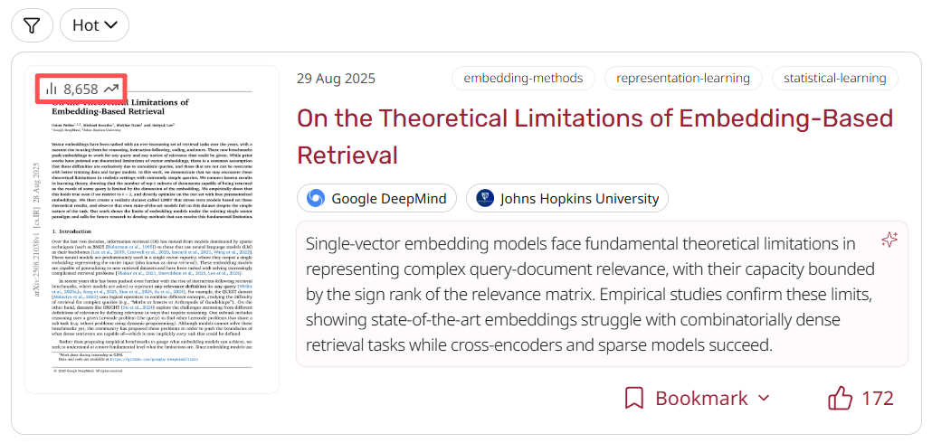 这几天,一篇关于向量嵌入(Vector Embeddings)局限性的论文在 AlphaXiv 上爆火,热度飙升到了近 9000。