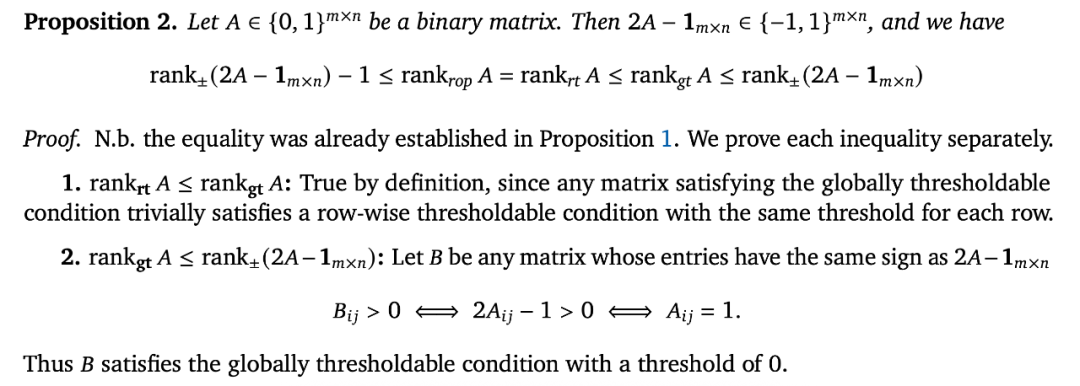 具体来说,给定某个二进制相关矩阵 A ∈ {0,1}^m×n,至少需要 rank_±(2A − 1_m×n) − 1 个维度来精确捕获 A 中的关系,并且最多需要 rank_±(2A − 1_m×n) 个维度就能实现。