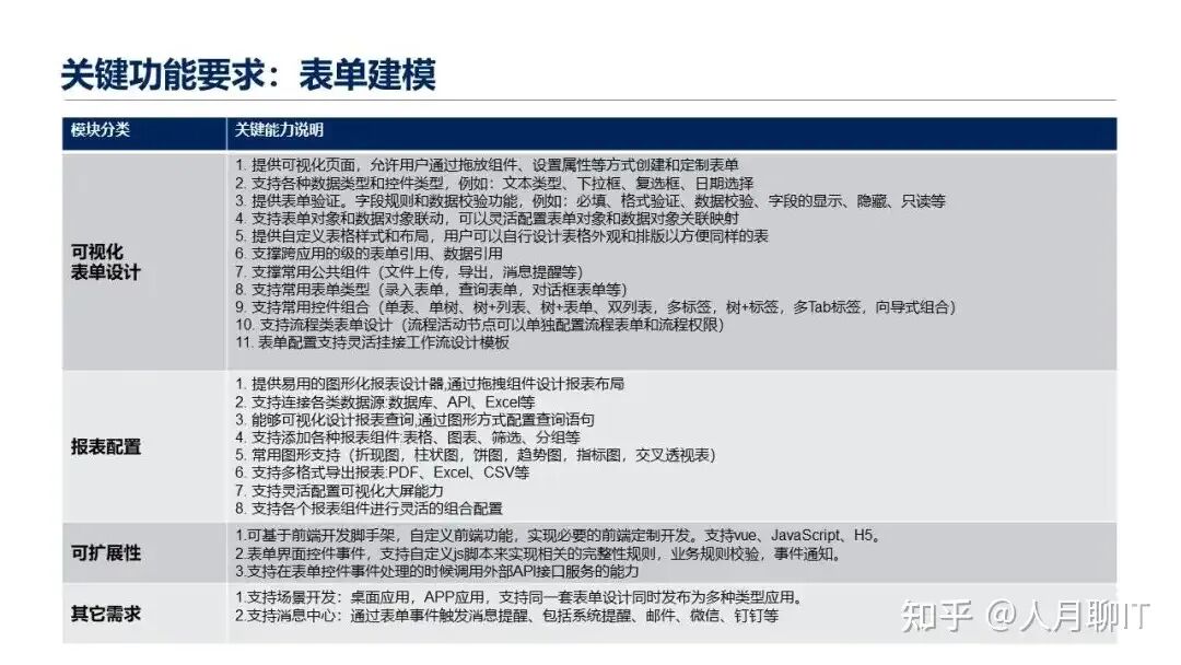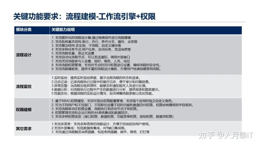 第一类就是基础能力要求,这一块就是包括我们通常说的流程引擎的能力、组织权限的能力、可视化的表单配置、对象建模、数据建模、表单类的需求、规则引擎的能力。