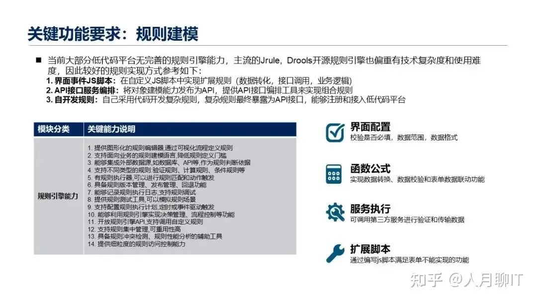 对于规则建模来讲,其实当前大部分的低代码开发平台没有完善的规则引擎能力,因为我在10多年前就在使用相应的一些规则引擎,所以类似于原来主流的jRule,Drools这一些开源的规则引擎,它其实仍然也是偏重,有技术复杂度和使用难度。这些规则引擎也不是说有引入到一个完整的低代码开发平台的一个必要性,所以我的理解较好的规则实现。主要的参考方式主要有以下三类。