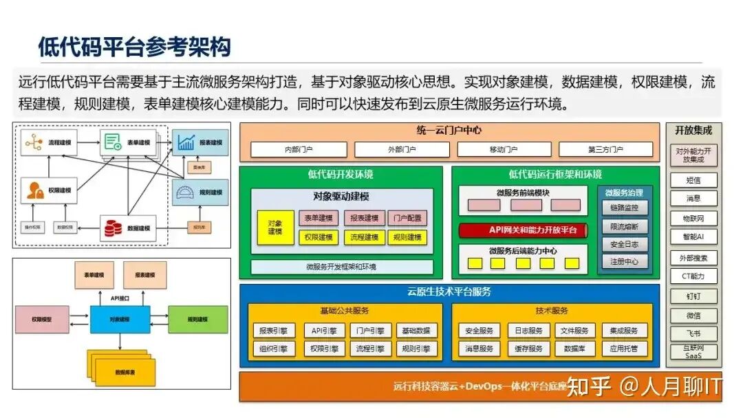 所以低代码开发平台它的整个的参考架构是怎么样呢?就拿远行我们自己的低代码开发平台来说,该平台是基于主流的微服务架构打造基于对象驱动的核心思想,实现对象建模、数据建模、权限建模、流程建模、规则建模,表单建模核心的建模能力,同时可以快速发布到云原生的微服务运行环境。