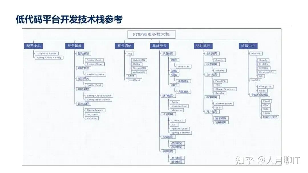 对于低代码开发平台开发技术栈的一些思考,类似于它的配置中心的选择、服务的管理、服务的通信、基础的消息缓存认证、校验权限服务的能力,包括一些我们说的丰富的组件库组件服务的能力,比如说报表服务、文件服务、搜索服务,下面一个就是我们的一个数据中心,它是不是支持结构化的数据,非结构化的数据,包括多数据库的支撑能力。