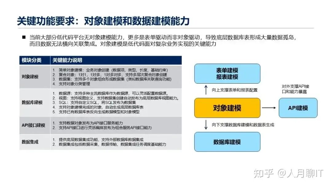 但是我们现在看到当前大部分的低代码开发平台,其实它没有对象建模的能力,更多的是表单驱动或者是非对象驱动,在这种场景下就容易导致底层数据库表形成大量的数据孤岛,而且数据没有办法横向关联集成,所以你会发现你虽然用了低代码开发平台,但是又是建了一个个烟囱式的小低代码应用出来,这个不是我们期望看到的。