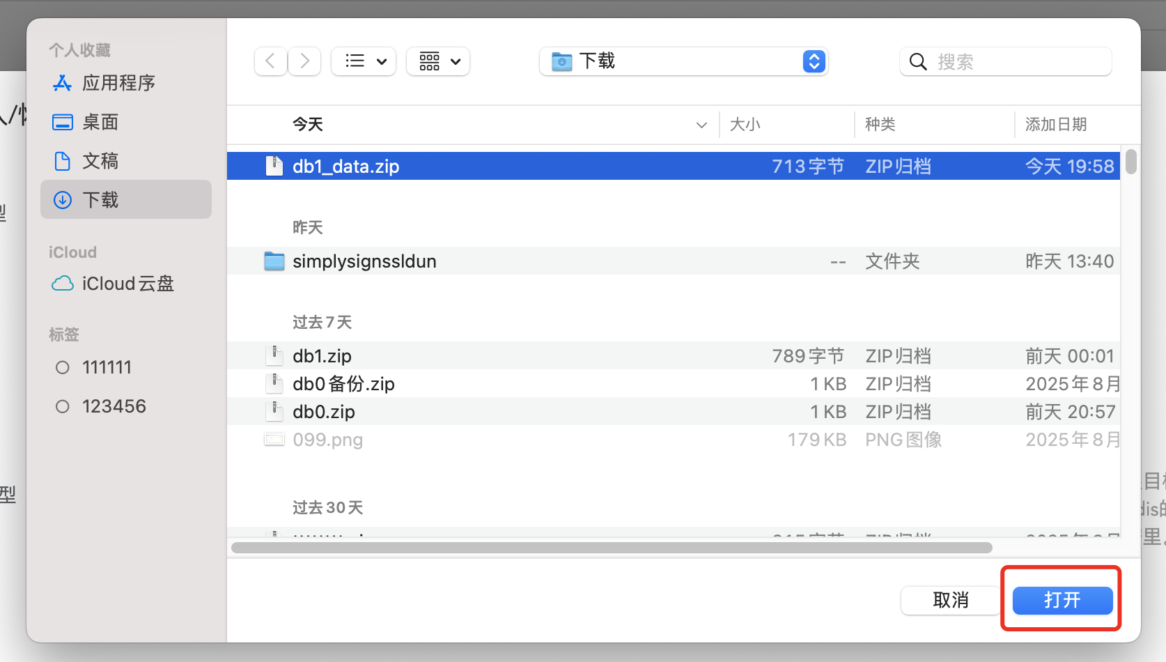 点选择备份文件导入后,会弹出选择文件的对话框,可以选择之前保存到本地的zip文件导入数据