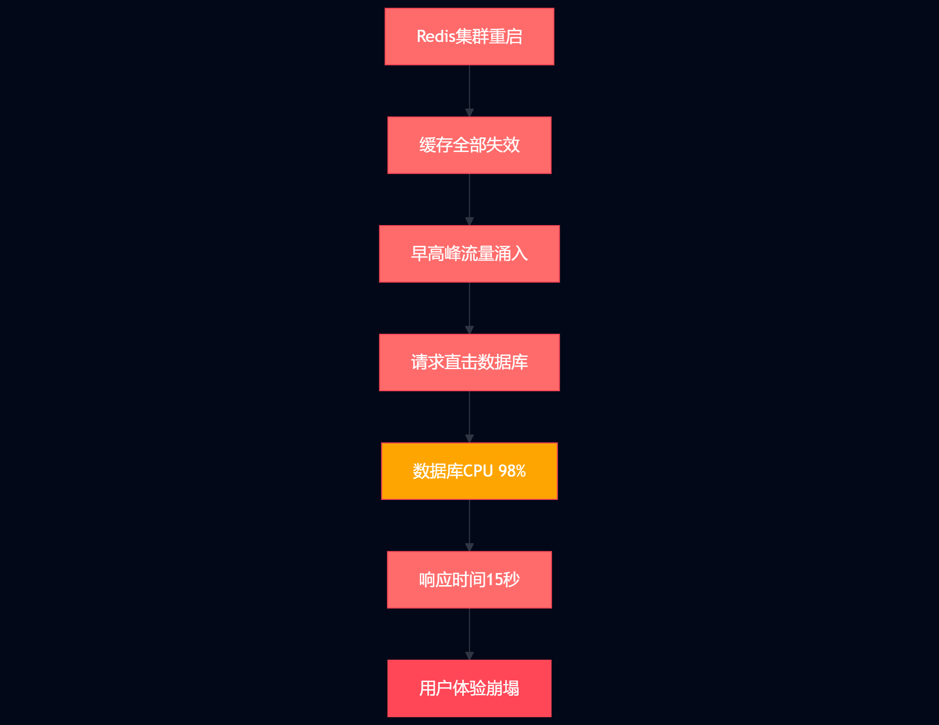 图1:缓存雪崩事故流程图 - 展示从Redis重启到系统崩溃的完整链路