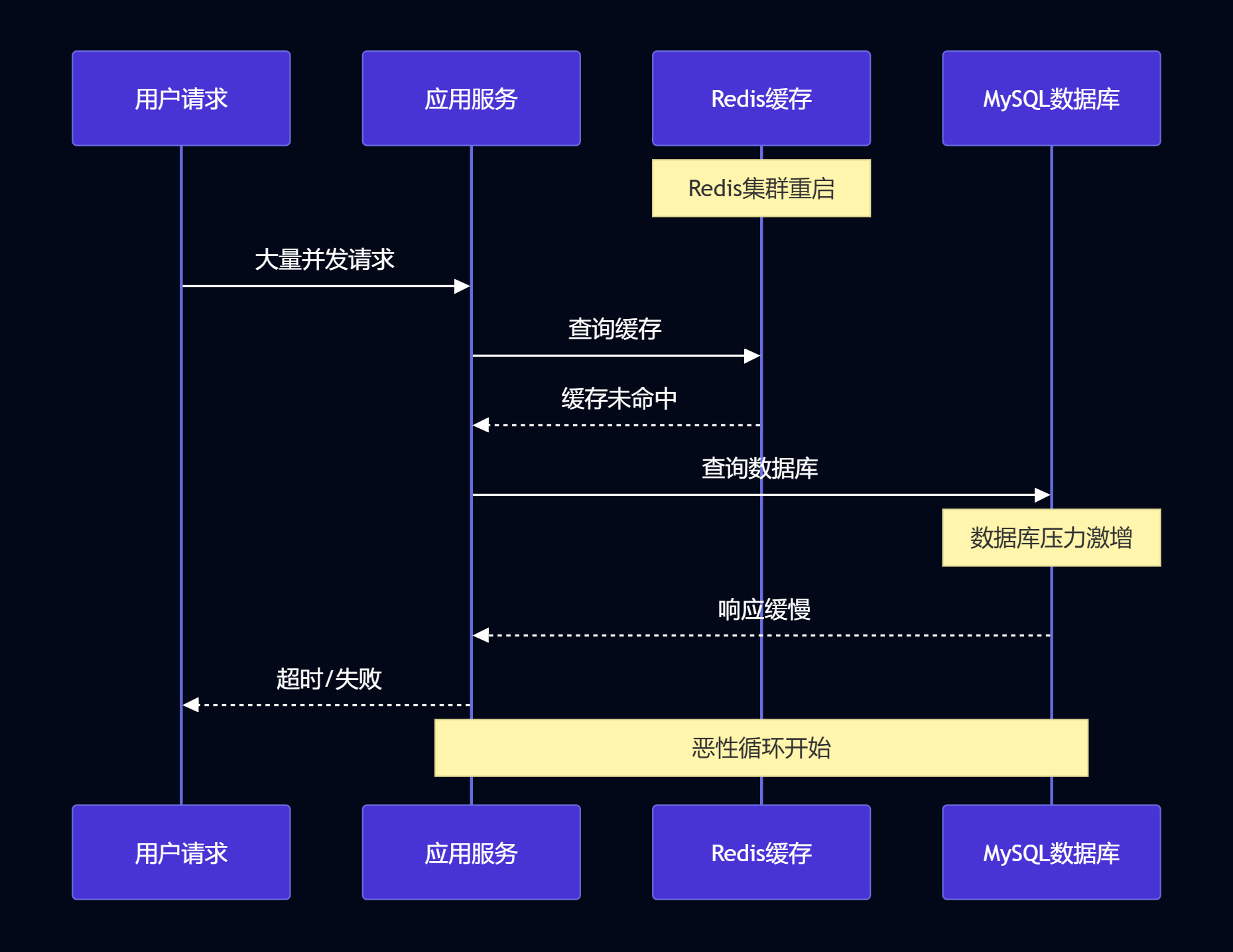 图2:缓存雪崩时序图 - 展示请求处理的完整时序流程