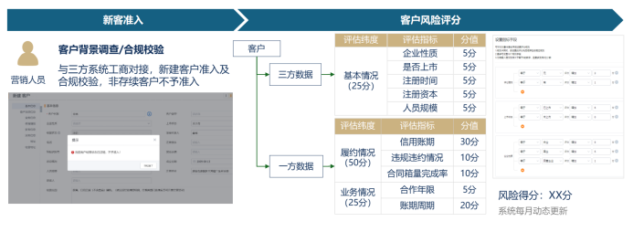 CRM支持新客户的准入和风险评估。通过与三方系统工商对接,CRM可以自动进行客户背景调查和合规校验,降低合作风险。同时,CRM还提供智能化客户风险评分能力,帮助企业动态监控客户风险状况。