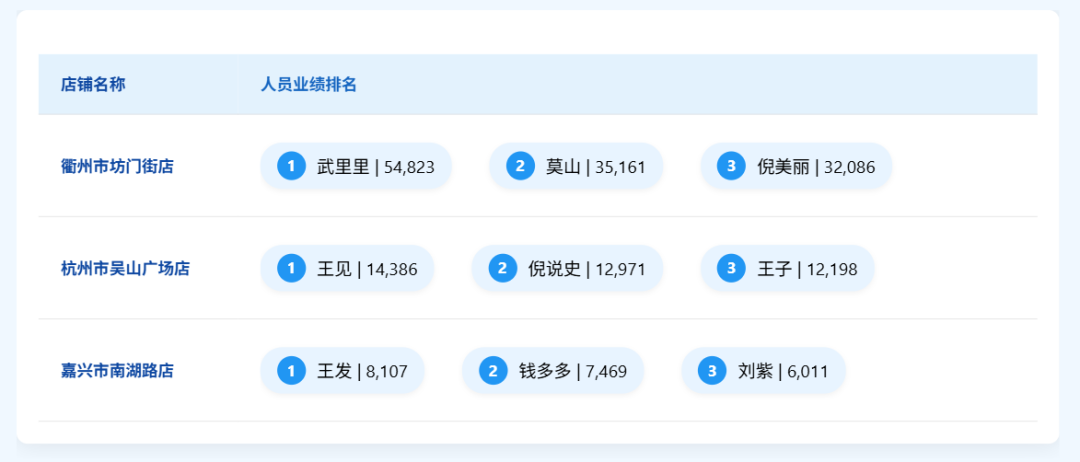 效果如下图所示,展示每个店铺的Top3业绩员工: