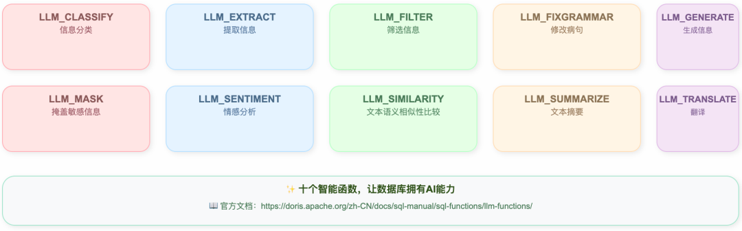 Apache Doris 4.0 预测一口气推出了十个LLM函数,每一个都针对实际业务场景设计: