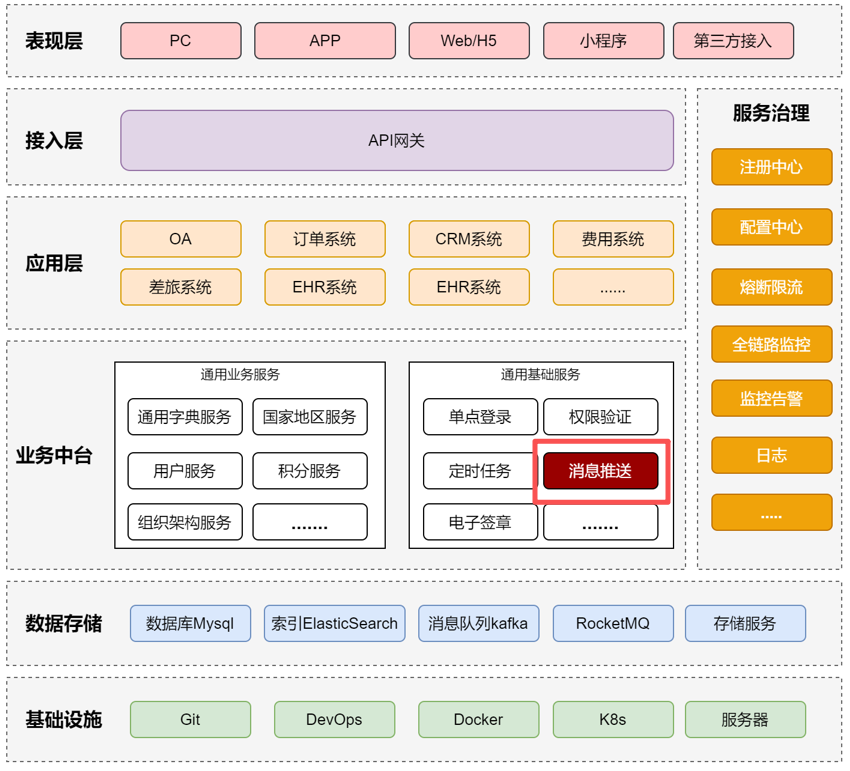 从架构结构来看,一个复杂业务平台通常涵盖表现层、接入层、应用层、服务层(含中台)及基础层等核心模块。作为业务系统中不可或缺的组成部分,推送服务并不直接面向终端用户,而是支撑各类应用稳定运行的基础性服务。它在整体架构中的具体位置如下所示: