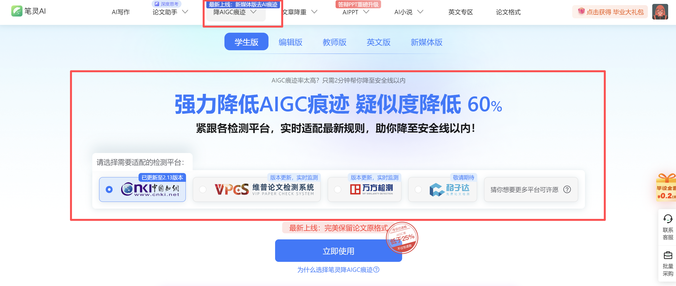 但是这个降AI平台暂时只适配知网、维普、万方,如果你的学校要求格子达的话还是别用了。