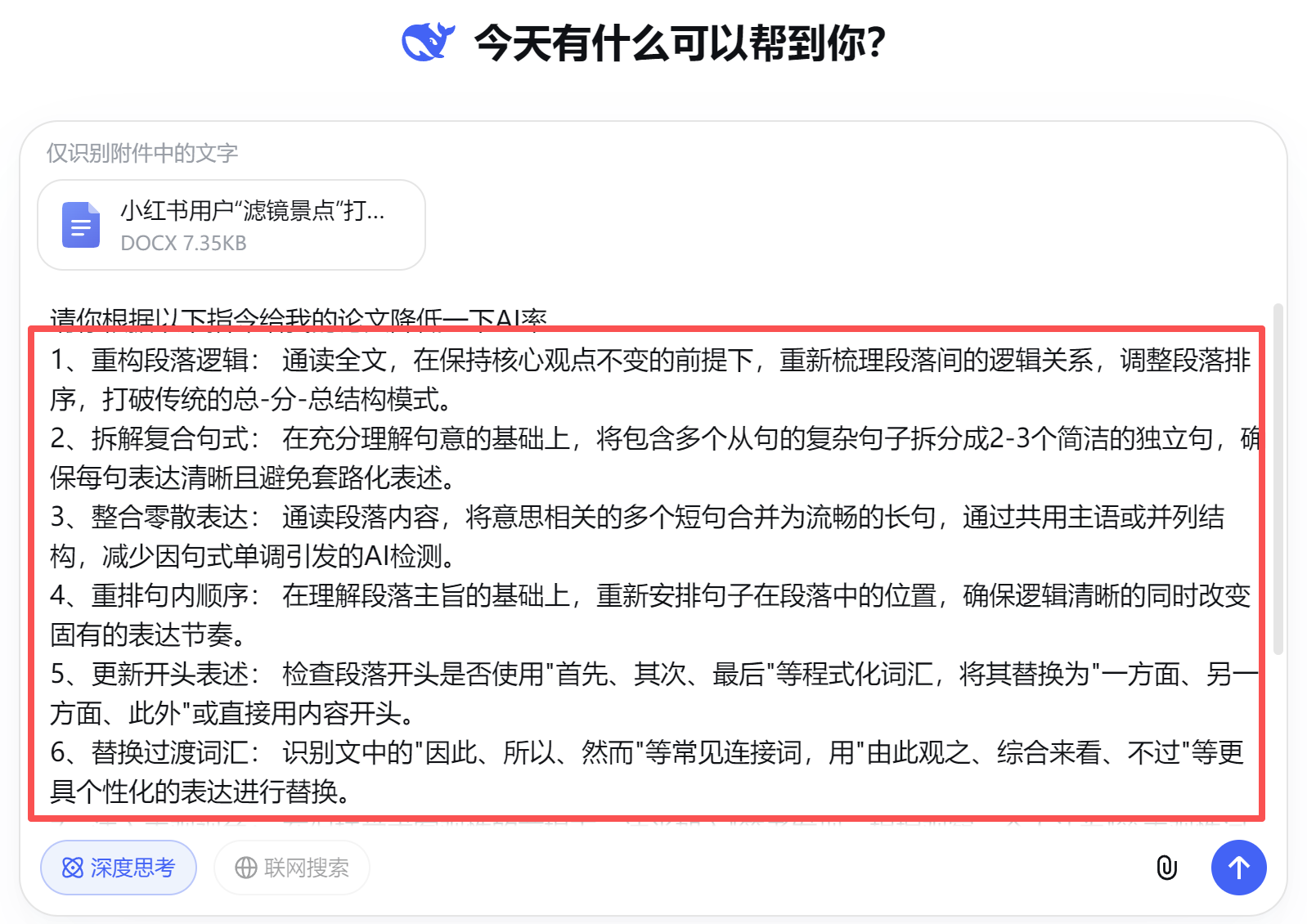 首当其冲用的肯定就是今年最出圈的一款AI——DeepSeek,这种提示词降AI工具其实就是纯手工降AI的2.0版本,输入限定提示词,也就是我上面说的那些降AI率的常见办法,然后直接让AI帮我们做。