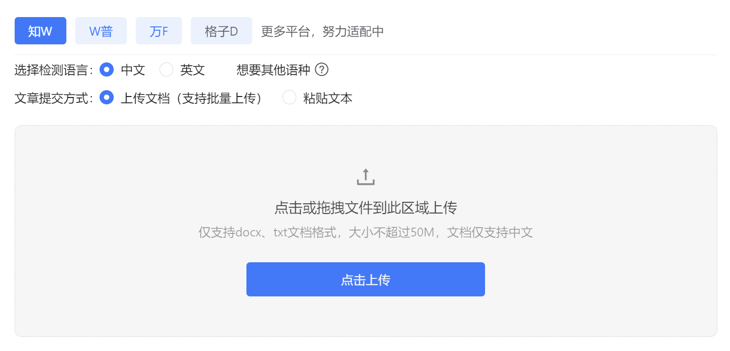 操作也相当简单,仅需选择适配的检测平台,选择检测的语言,然后直接上传文档/粘贴文本即可一键降AI。