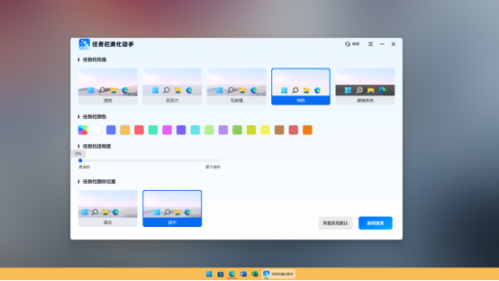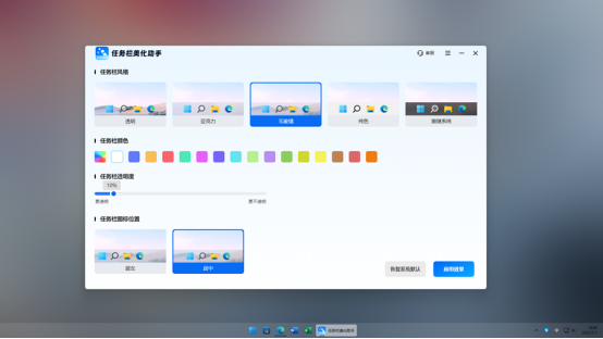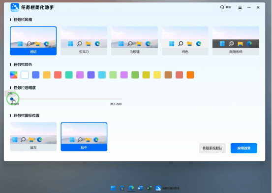 任务栏美化助手是一款适用于Windows系统的强大任务栏美化工具,能让你轻松摆脱传统任务栏的单调模样。软件内置了透明、亚克力、毛玻璃、纯色和跟随系统等丰富多样的风格模板。只需一键点击,就能瞬间改变任务栏的视觉风格,轻松适配不同的审美需求与使用场景。