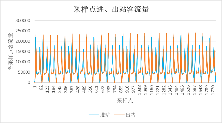 out数据表中,以72个采样点为周期(每天为周期)。每天的72个采样点,第15-16采样点,达到顶峰,客流量最大,276个运营站点共大约23万客流量。第55-56采样点为第二顶峰,276个运营站点共大约14-16万客流量。每天第一个采样点,客流量最小,几乎为零。23-46采样点客流量为第二波谷,较为平缓。