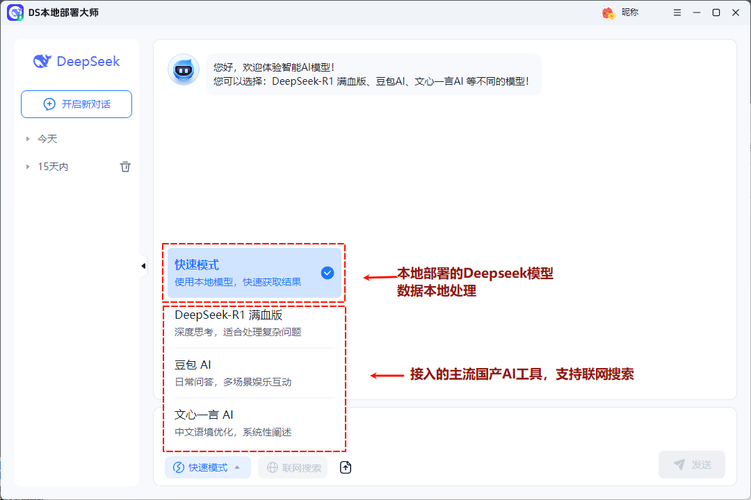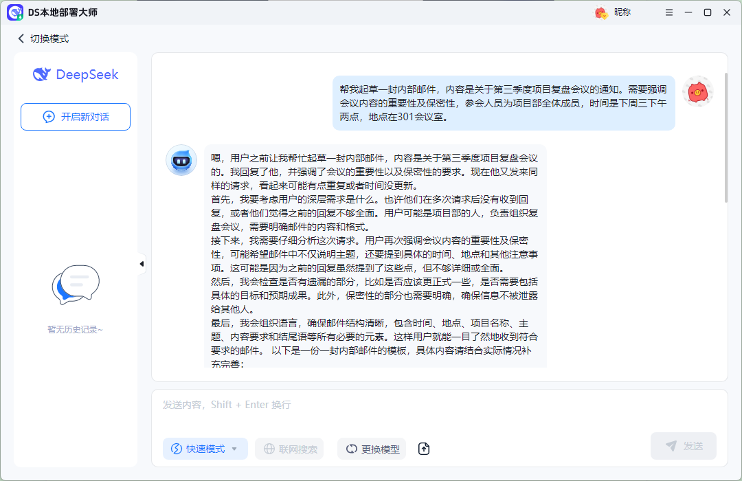 部署完成后软件会自动切换到对话界面,此时,可以在对话框中输入问题,与本地的AI进行交流了。集成了本地快速模式、在线AI模型(如DeepSeek、千问、豆包、文心一言)和联网搜索功能,使用起来更加灵活。