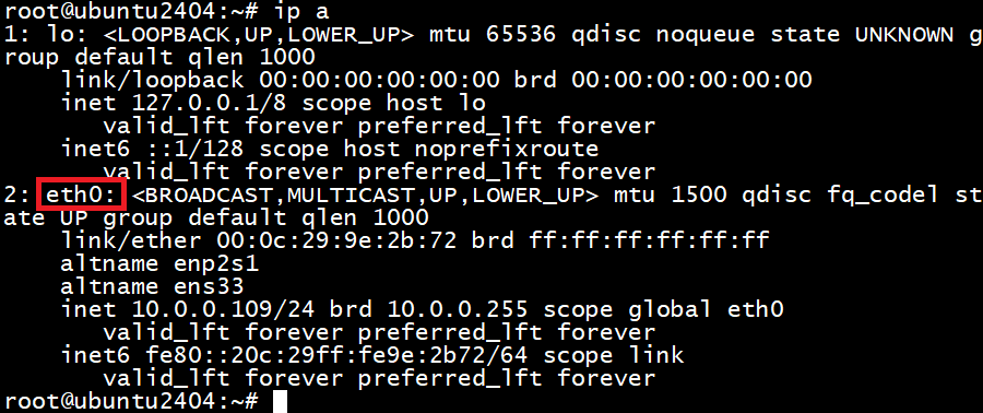 enoXen 表示 Ethernet(以太网),o 表示 Onboard(板载),X 为索引号eno1、eno2ensXen 表示以太网,s 表示slot (插槽),X 为插槽号,s33 表示 Slot 33ens1、ens33enpXsYen 以太网,p0 表示 PCI 总线号(Bus 0),s3 表示插槽号(Slot 3)enp0s3、enp3s0wlpXsY(无线网卡)wl 表示 Wireless LAN,无线网卡,p2s0 表示 PCI Bus 2 Slot 0。wlp2s0ethXnet.ifnames=0,然后更新并重启系统以ubuntu2404为例,默认网卡名称如下