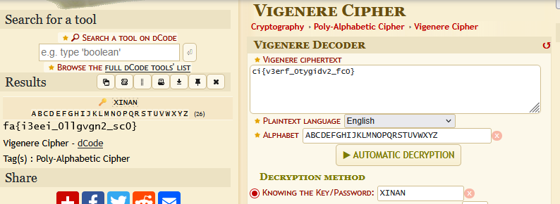 这里得到的一串类似flag形式的字符串,可惜这个不是flag。有了flag的形式但不是flag就考虑是否是移位密码或者替换密码。这里尝试了一部分解密方法但始终得不到原文。想到有可能是维吉尼亚密码,需要一个key才能解出。(比赛遇到维吉尼亚没有key并且另外一部分找key的题目不会不用慌,也可以尝试爆破key,这里推荐一个网站。)
