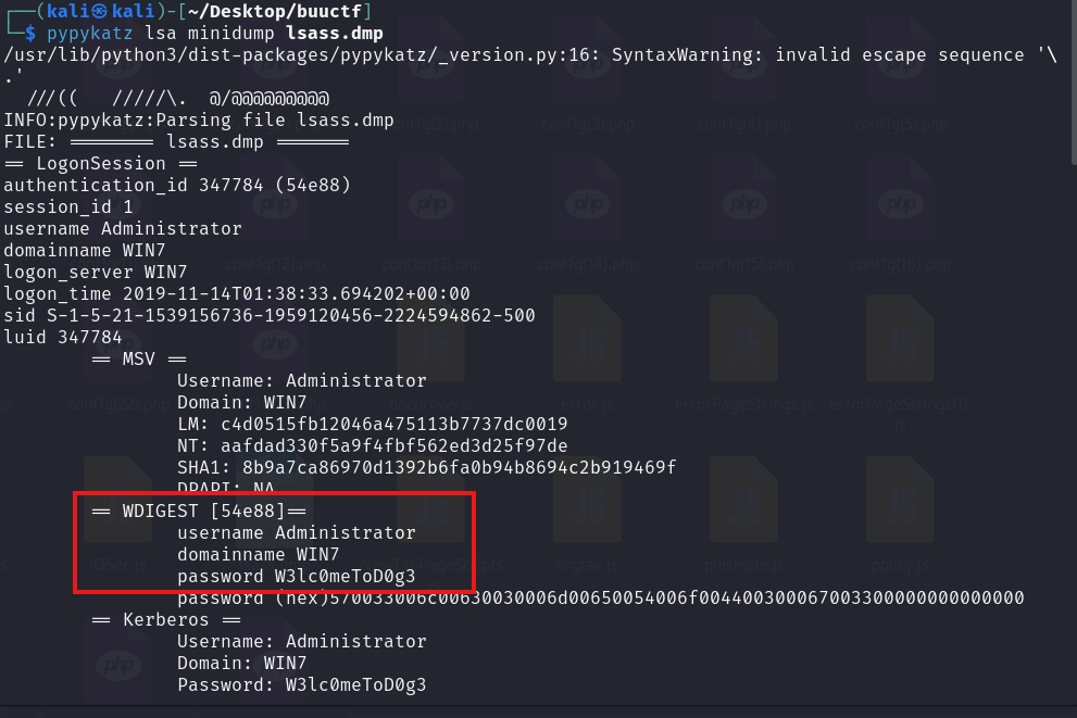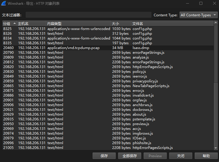 这里就尝试下载该文件,然后用kali中内置的“pypykatz”来提取文件中的关键信息。下载仅需要工具栏中选择“文件”-“导出对象”-“HTTP”就可以直接看到所有文件。