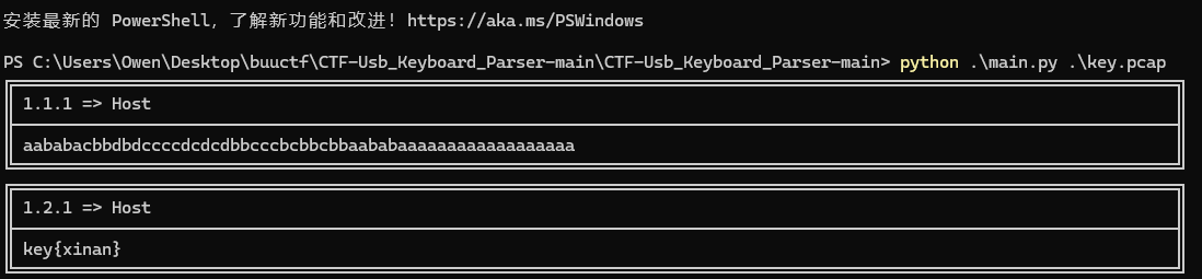 用wireshark打开该文件,发现文件流量都是USB流量。这里就需要USB流量分析了。常见的flag隐藏方式是键盘敲击和鼠标移动点击来表示flag。这里先用这个工具脚本看是不是键盘流量。这里跑脚本也是直接出现了key。