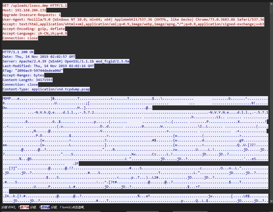 最后一条看起来比较特殊,右键选择追踪HTTP流,发现是请求到了一个lsass.dmp文件。该文件一般存放的是主机的凭证,一般可以从中得到用户信息比如密码,在取证中经常用到。
