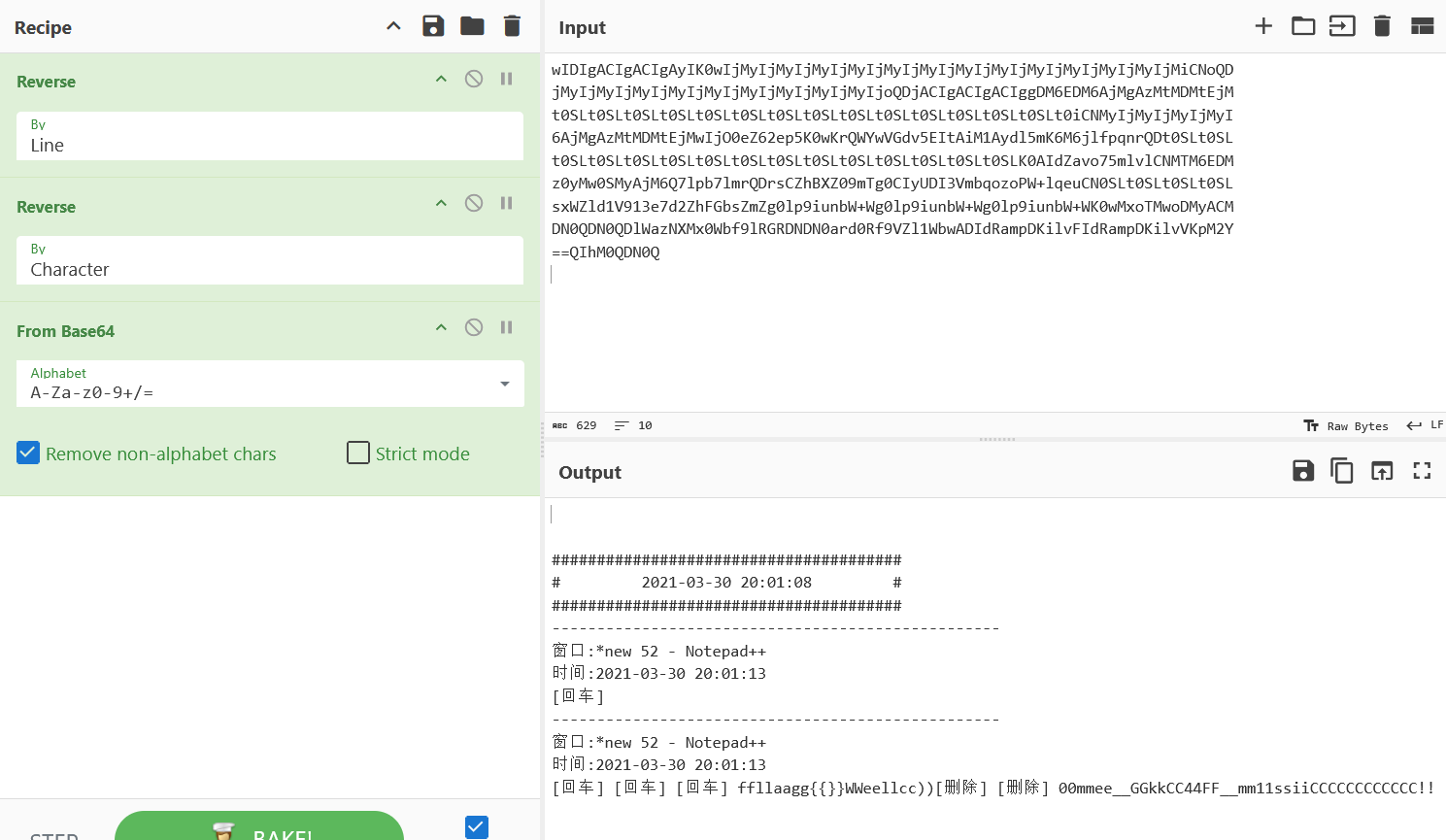 这里为了解析,可以在CyberChef中搜索reverse函数,为了每一行单独reverse,需要两次函数配置,最后结果再进行base64解码就行,类似我这里的配置,最终就可以得到一串重复处理的flag。