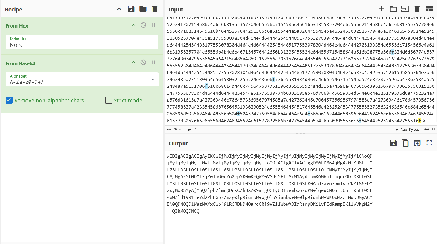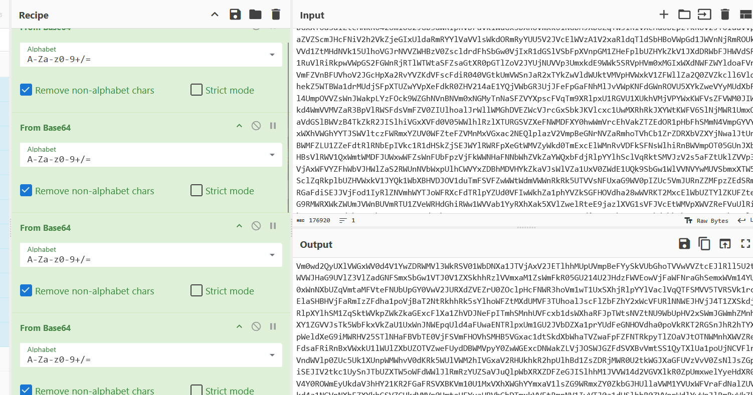 工具自动修复后解压缩该压缩包,发现其中的flag.txt文本内容是一个长串的base64,放进CyberChef后发现可以进行多次的base64解码,这里写个脚本快一点。