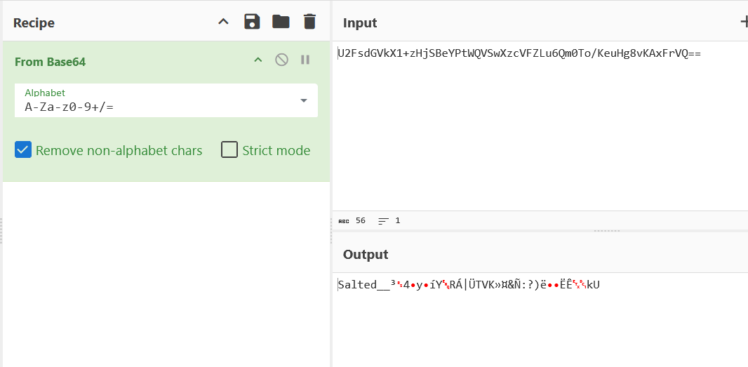 把开头这部分像是某种编码的字符串放进CyberChef,没有自动识别出来,尝试用base64解码,发现开头是salted。