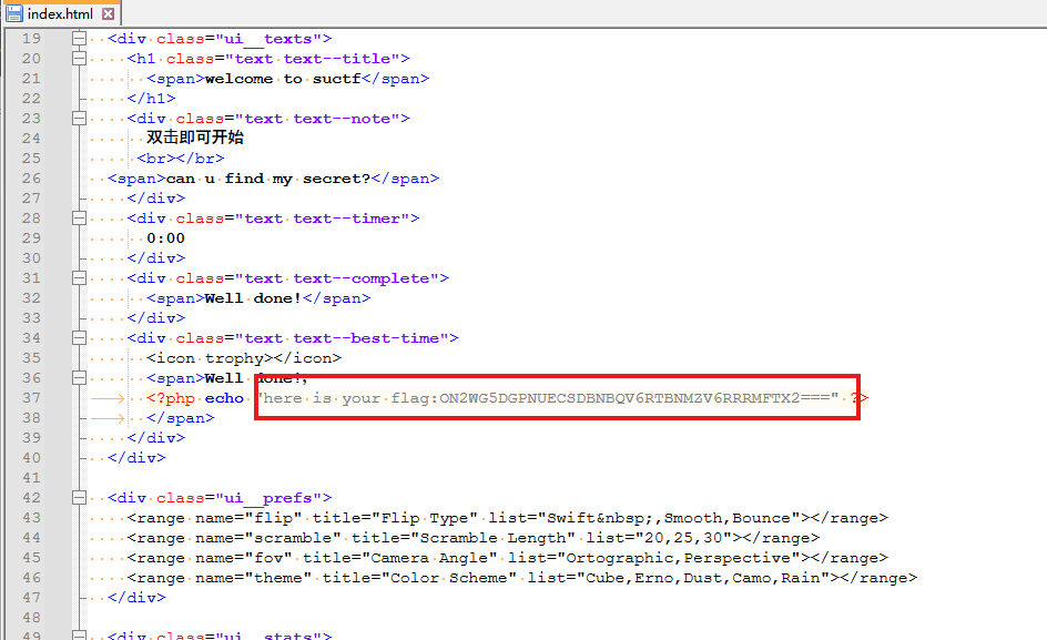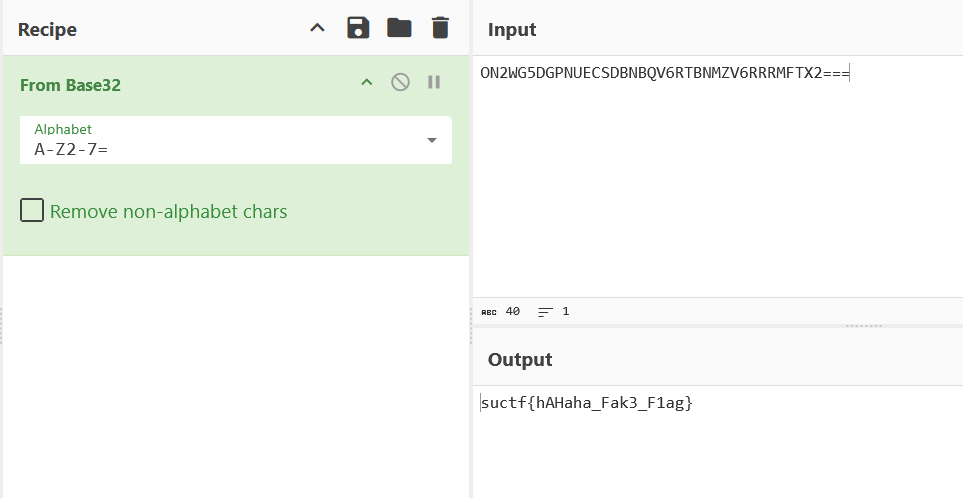 下载题目文件,一张图片和一个网站前端代码的压缩包。先看网站前端代码,其中有个html文件,在其中发现了一个字符串,放进CyberChef自动解析是base32编码,得到“suctf{hAHaha_Fak3_F1ag}”,可惜得到的并不是真正的flag。