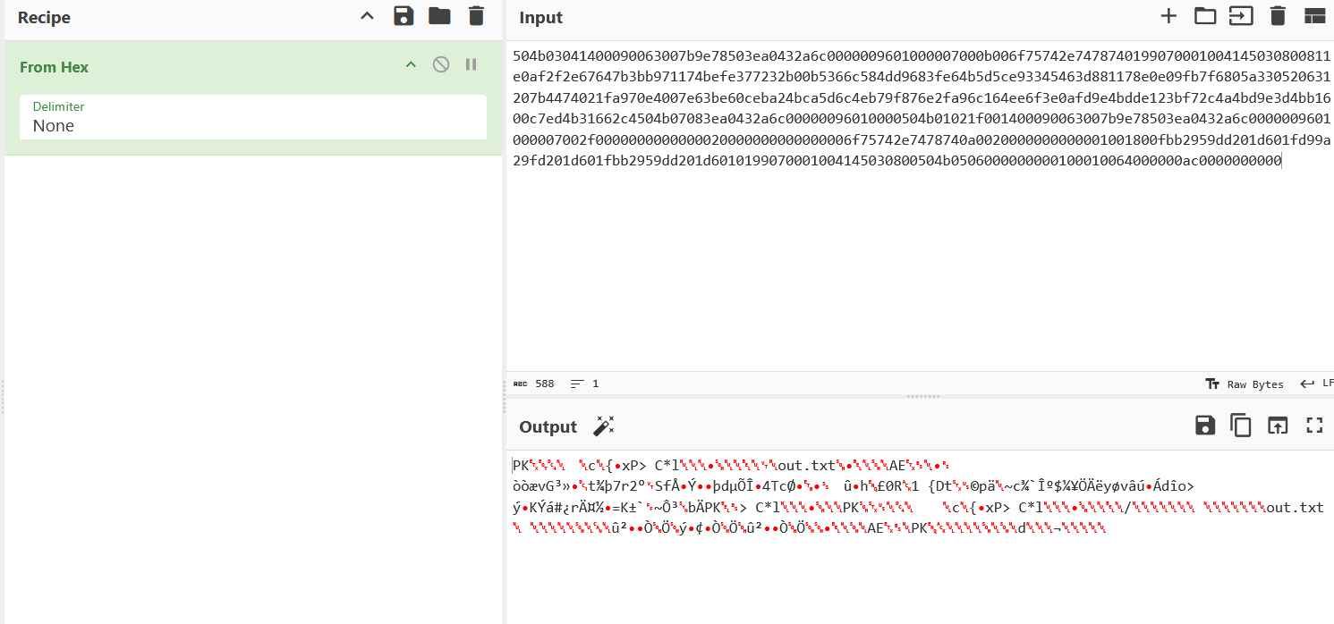 这里我们把这些字符复制并放入CyberChef,发现好像是一个缺少了文件头的压缩文件。这里通过在开头加“504b”修复文件。
