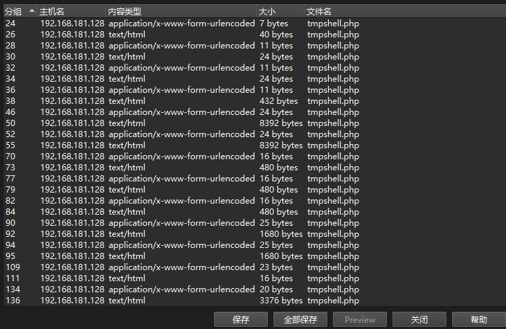 下载题目文件,是个pcapng日志文件,放进wireshark中进行分析。总体流量不大,所以想着看看有哪些文件,选择“文件”-“导出对象”-“HTTP”发现所有文件都是tmpshell的php文件,这里全部下载到本地看看具体文件内容。