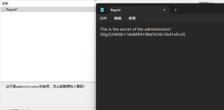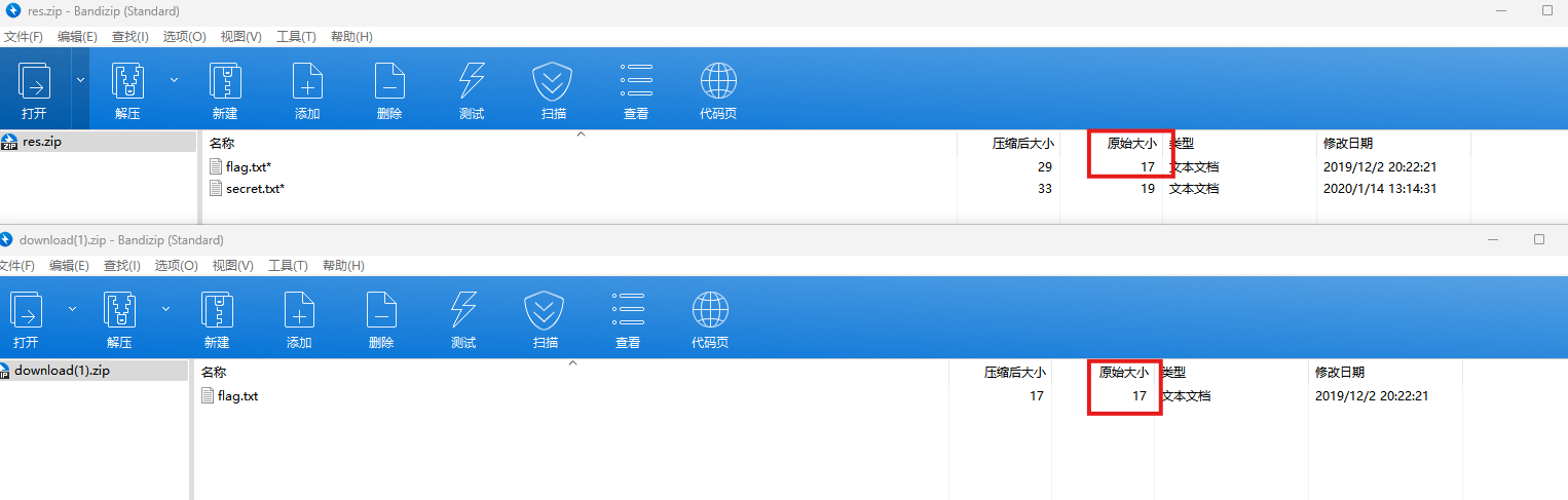 将输出保存为压缩文件在本地,里面同样有一个flag.txt文本文件,但其中不包含任何有用信息。这个时候我们需要得到的是另外一个有密码的压缩文件中的内容。通过预览我们知道其中也有一个flag.txt,通过大小可以猜测这两个文件是相同的。而我们的目的是得到secret.txt,这种时候就可以尝试使用明文攻击了。
