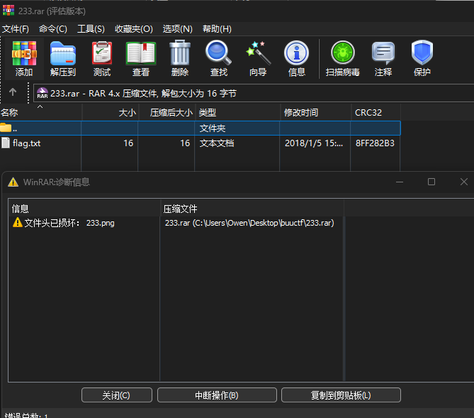下载题目文件,包含两个文件,一个压缩包和一个ftm文件。先看压缩包,里面有一个文本文件,可惜啥也没有。想着看看有没有NTFS备用数据流隐写,用WinRAR解压缩结果出现了报错。报错显示压缩包内还有一个png图片但是文件头出错了。
