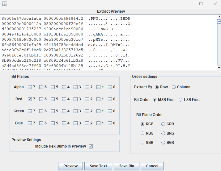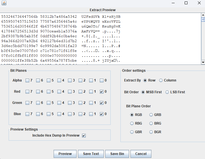 打开Stegsolve并选择Data extract,配置好LSB通道后预览结果。