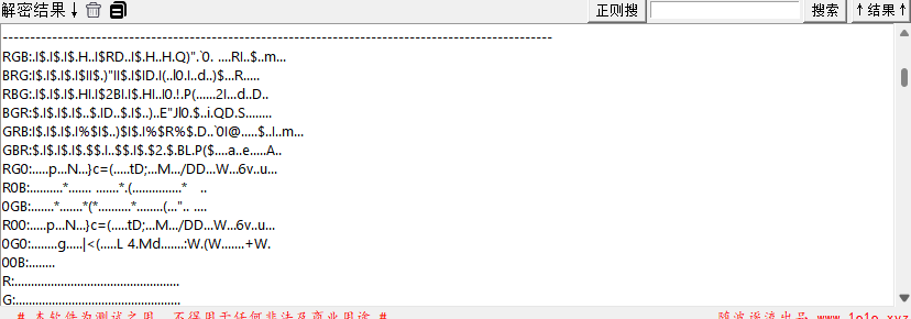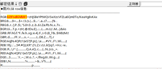 接下来看图片,直接放进随波逐流工具,发现LSB通道下存在数据,并且以RGB作为位平面顺序时存在一个类似密文的字符串。
