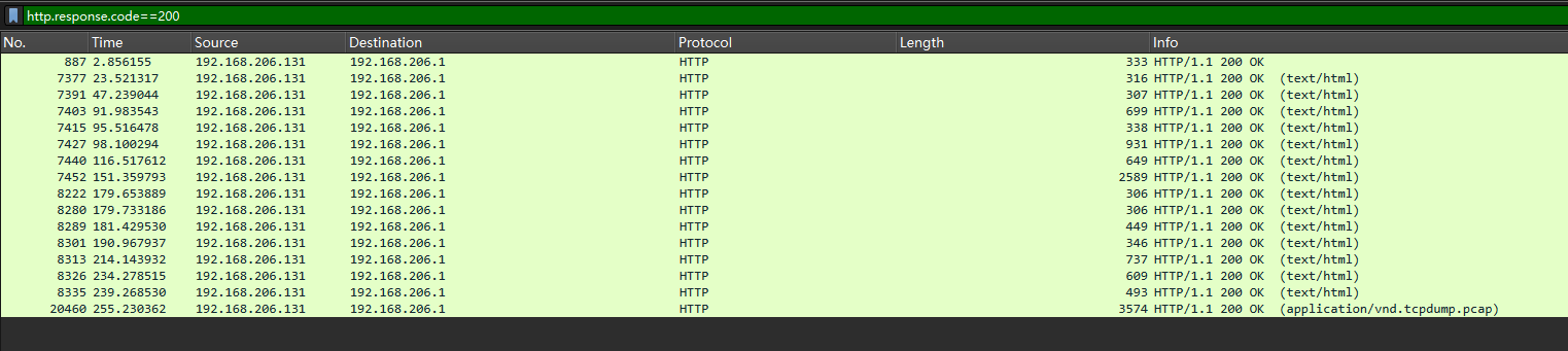 下载题目文件,是个pcapng日志文件,用wireshark打开开始分析。发现流量很大,而且大多数都是404。这里通过“http.response.code==200”过滤响应码是200的日志,发现结果如下。