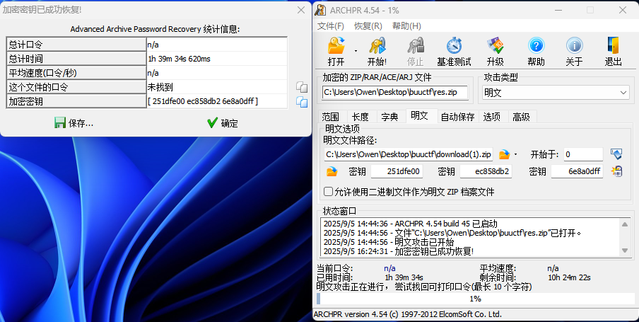 这里还是使用ARCHPR作为明文攻击的工具。明文攻击的时间会比较长,需要耐心等待,等待期间可以先完成后面的题目。配置和最后的结果如下(明文文件路径要选择之前修复好的压缩包文件路径)。